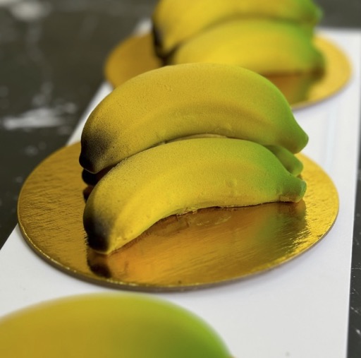 The Caramelized Banana with Milk Chocolate Mousse Cake is a decadent dessert that combines the rich flavors of caramelized bananas with a smooth, creamy milk chocolate mousse. The cake features layers of moist cake and luscious milk chocolate mousse, complemented by the sweet, caramelized banana topping. This indulgent combination offers a delightful balance of fruity and chocolaty flavors, creating a luxurious and satisfying treat.