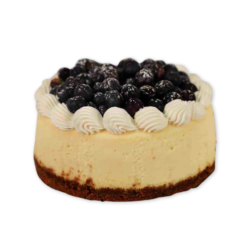 Fluffy vanilla bean cheesecake base on crunchy graham crumbs topped with homemade citrus blueberry confit.