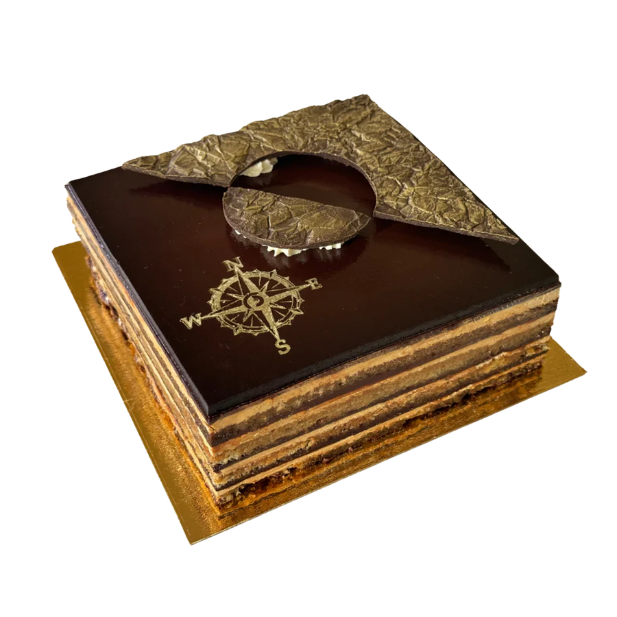 The 12-Layer Coffee Opera by Chocolate Room is an exquisite French dessert crafted with twelve delicate layers of almond sponge cake, each soaked in a rich coffee syrup.